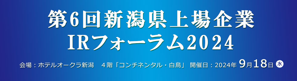 第6回新潟県上場企業IRフォーラム2024 開催日 2024年9月18日(水) 11:15~17:10 「第6回新潟県上場企業IRフォーラム2024」 くわしくはこちらをご覧ください(PDFファイル:6,158KB) 会場 ホテルオークラ新潟 4階「コンチネンタル・白鳥」アクセス:新潟駅万代口よりバスにて5分「礎町」下車 主催 新潟県上場企業の会 共催 野村證券、大和証券、SMBC日興証券、みずほ証券、三菱UFJモルガン・スタンレー証券、岡三にいがた証券、第四北越証券 お問い合わせ・お申し込み お問い合わせ・お申し込みは、電話・メールフォームで受け付けております。 お問い合わせ・お申し込み 第四北越証券 新潟営業部 025-226-5010 メールでのお申し込み 以下のボタンからお申し込みフォーム画面へ移動します。